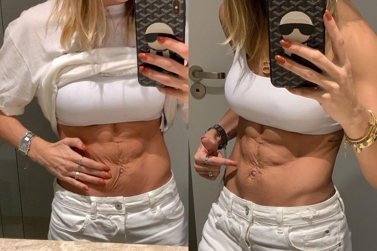 “As duas primeiras fotos mostram minha barriga quando estou reta e esticada”, explicou (Foto: Reprodução / Instagram @bellafalconi)