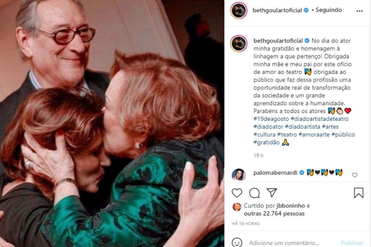 Em agosto do ano passao, foi comemorado o Dia do Ator e Beth Goulart fez questão de celebrar a data com uma homenagem para os atores que ela mais admira: os pais,  Paulo Goulart e Nicette Bruno. Para isso, a atriz compartilhou uma foto ao lado dos pais no Instagram e aproveitou para fazer a homenagem.
