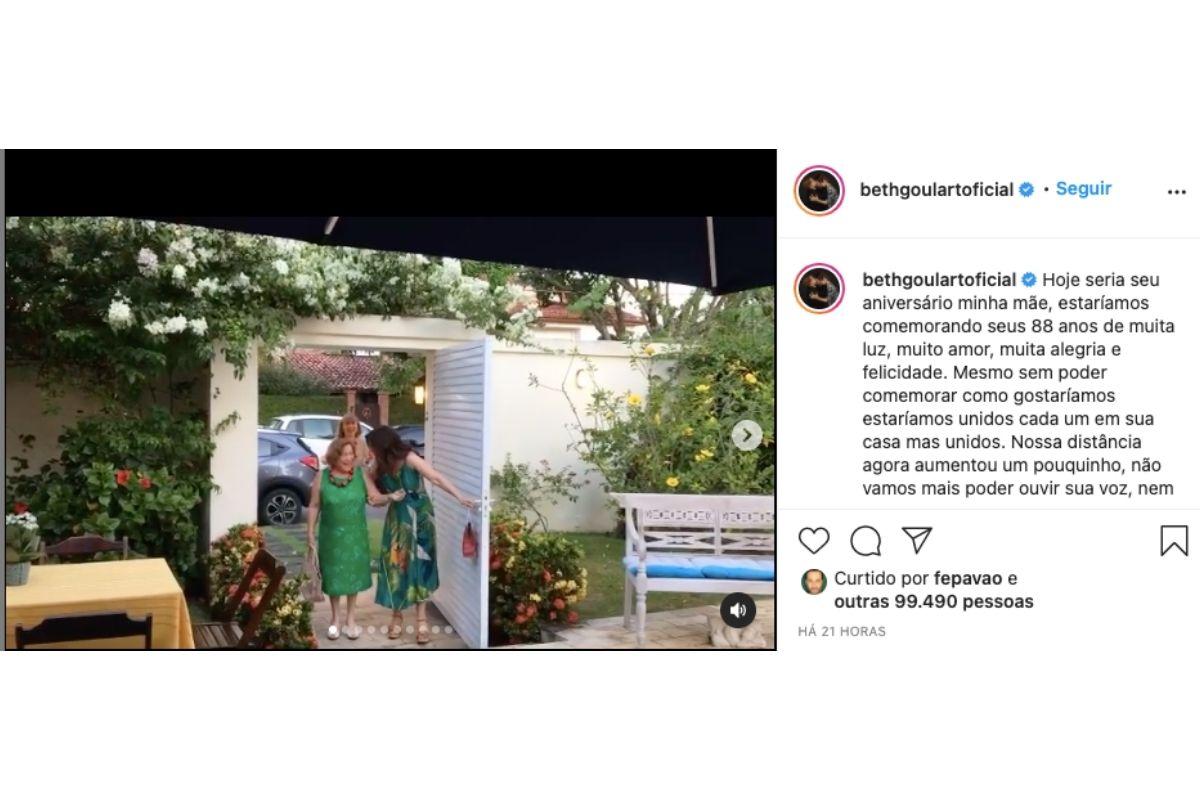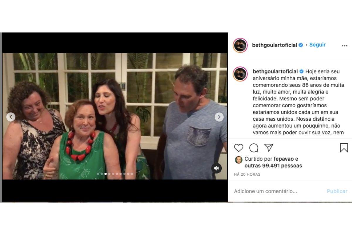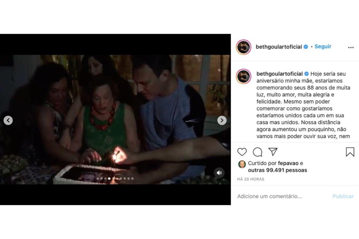 “Vamos chegar aonde a luz repousa, onde a paz caminha solta, onde o sonho está sempre acordado e o brilho de seus olhos ainda nos toca a alma. Feliz aniversário, minha mãe, agora aonde o tempo não tem mais ponteiros nem a calmaria tem solavancos, onde a beleza da vida se perpetua na eternidade. Feliz aniversário, minha mãe! Te amo, mãezinha! Gratidão!”, concluiu Beth.