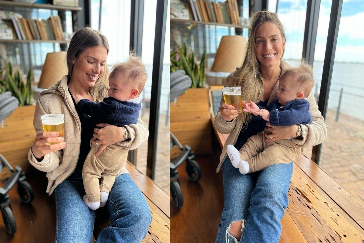 Bia Feres compartilhou uma sequência de fotos bebendo cerveja, ao lado do filho Isaac, de 4 meses. A ex-atleta estava comemorando o fim da amamentação, podendo agora tomar bebidas alcoólicas. Bia escreveu um texto emocionante junto com a publicação.