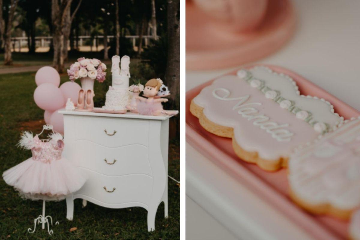 A comemoração foi pequena e contou só com a família. Para a decoração, eles colocaram bexigas cor de rosa e alguns enfeites de sapatilha de bailarina sobre uma penteadeira. Em algumas fotos, Biah aparece com os balões juntos dela segurando a filha.