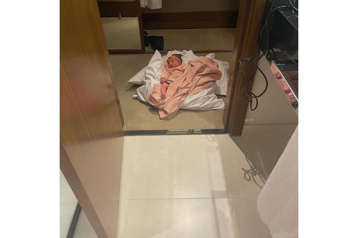 Em suas redes sociais, a mãe mostrou que encontrou uma solução para ficar de olho na filha mesmo tendo que usar o banheiro. A influenciadora publicou uma foto da pequena ‘esperando’ a mãe terminar as próprias necessidades na porta do banheiro, mergulhada em almofadas e cobertores confortáveis.