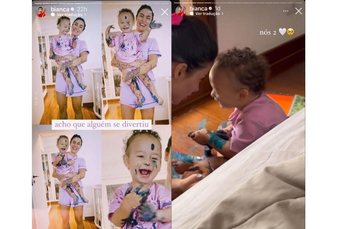 Ela mostrou o filho brincando com tinta guache e depois, ela mesmo brincando com ele. Ela ainda falou que tem várias fotos do filho no momento em que eles estavam brincando. “Acho que alguém se divertiu”, escreveu ela. Ela também falou: “Nós 2”. Vale lembrar que em vários momentos, Bianca fala do ex-companheiro e mostra momentos antigos do pai, Fred, com o filho, Cris.