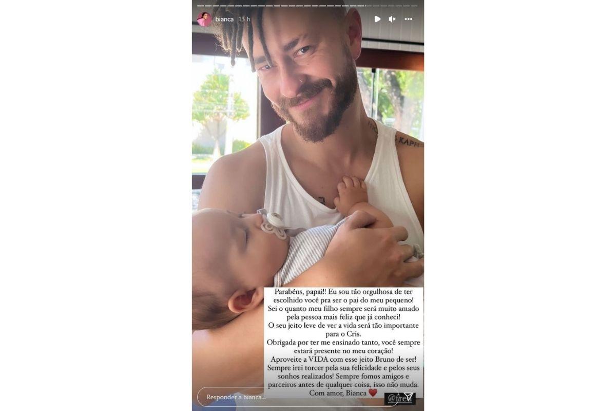Em uma foto de Fred segurando Cris, Bianca escreveu: “Parabéns, papai! Eu sou tão orgulhosa de ter escolhido você para ser o pai do meu pequeno! Sei o quanto meu filho sempre será amado pela pessoa mais feliz que já conheci! O seu jeito leve de ver a vida será tão importante para o Cris“, começou.