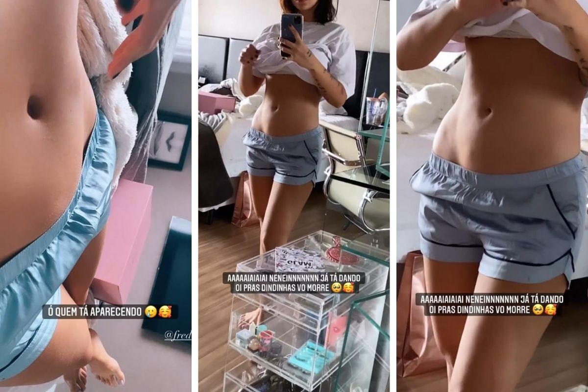 Na sequência dos Stories, ela mostrou o bebê aparecendo. No primeiro registro, a ex-BBB20 está deitada, passando a mão na barriga. “Ó quem tá aparecendo”, escreveu e marcou Fred. Já, no outro, ela apareceu em pé, diante do espelho, com a blusa levantada. “Aiaiai! Neném já tá dando oi pras dindinhas. Vou morrer”, se derreteu. Confira a imagem: