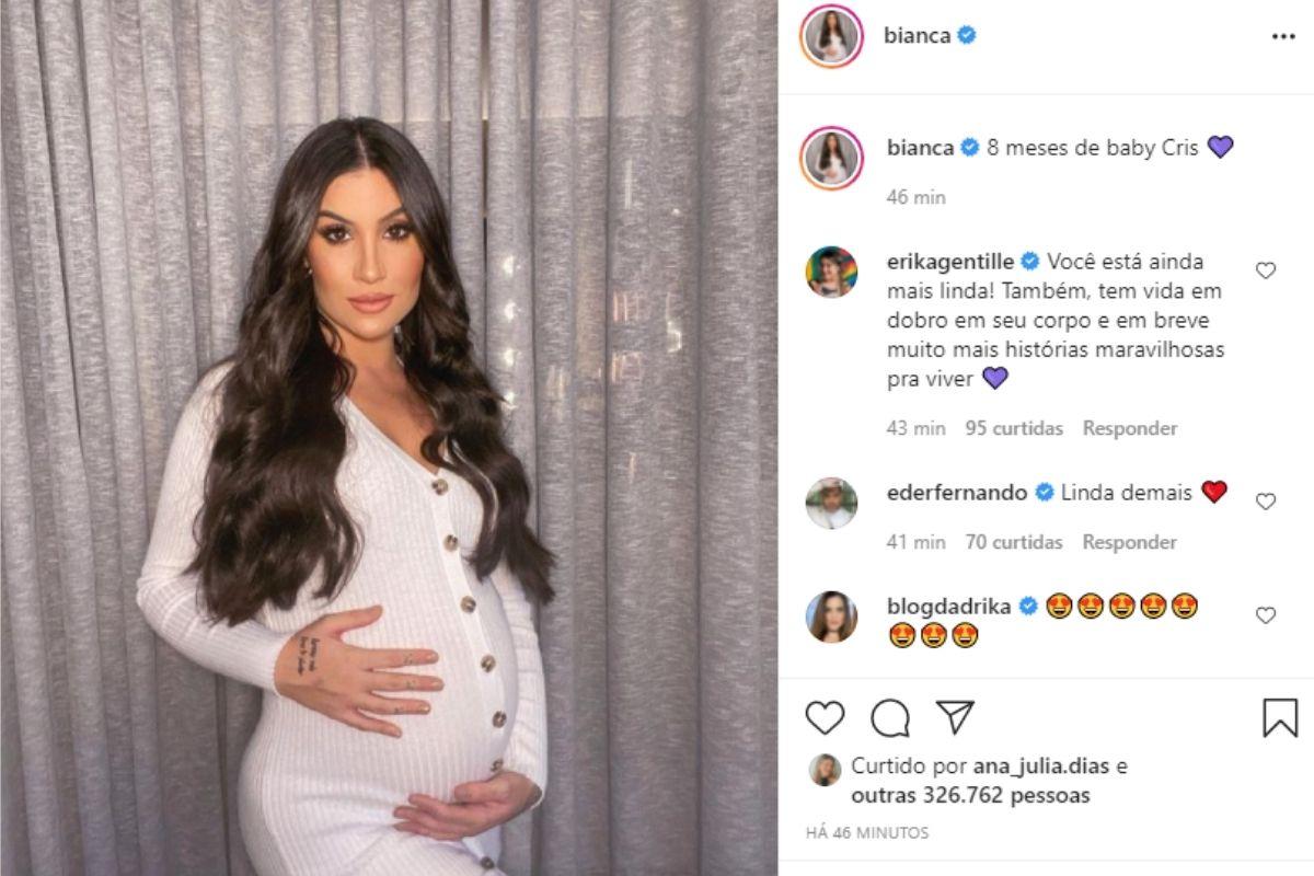 Na imagem, Bianca aparece usando um vestido branco com botões marrons e com a mão sobre a barriga. Os internautas amaram a publicação e logo começaram a comentar. “Você está ainda mais linda! Também, tem vida em dobro em seu corpo e em breve muito mais histórias maravilhosas pra viver”, elogiou uma seguidora. “Linda demais!”, elogiou outra. “Eitaaaa será que baby Cris vai ser canceriano?”, questionou uma terceira, tentando adivinhar o signo do garoto que deve nascer em breve. Veja a publicação abaixo: