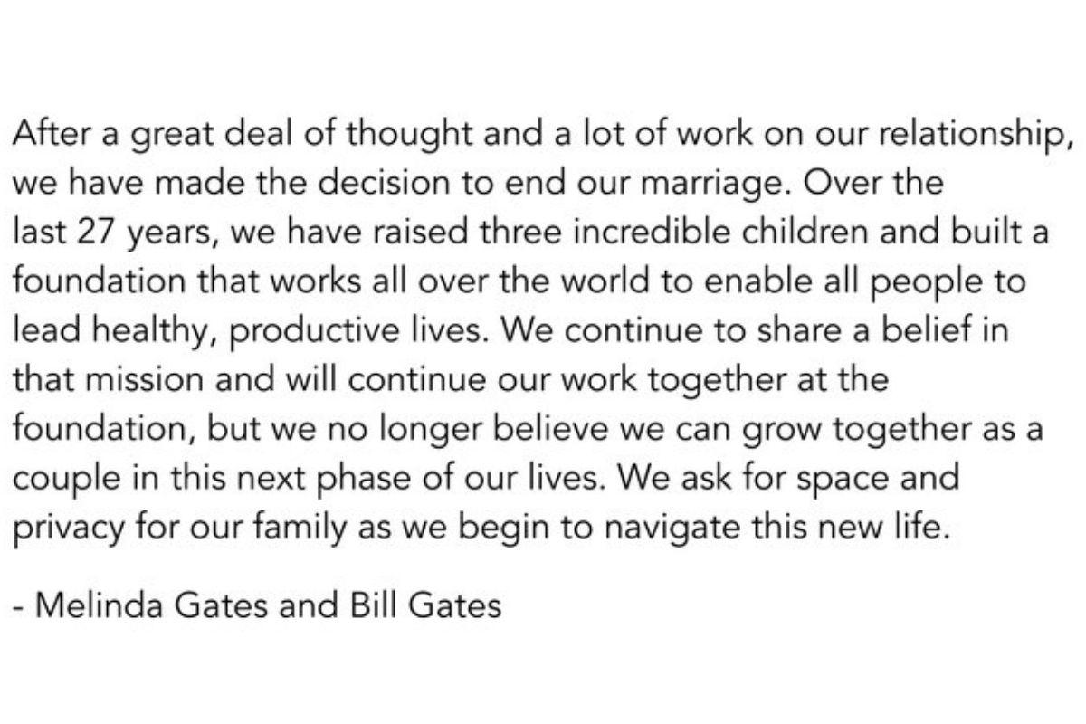 Bill Gates e Melinda Gates anunciaram o divórcio nesta segunda-feira, 3 de maio. Os dois estavam juntos há 27 anos e anunciaram a separação com um comunicado conjunto compartilhado na conta dos dois no Twitter. Ao longo desses 27 anos de casado, eles tiveram três filhos: Jennifer Katharine Gates, de 25 anos, Rory John Gates, de 21 anos, Phoebe Adele Gates, de 18.