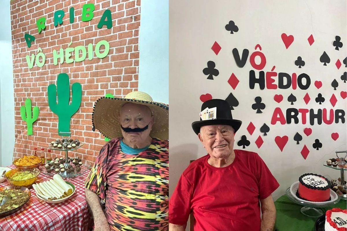 “Ele viu as festas para o bisneto Arthur e perguntou por que fazemos para o bisneto e não para ele”, acrescentou a filha. O primeiro mêsversário foi em julho de 2021, no aniversário de 90 anos de Hédio. Na ocasião, a família aproveitou e reutilizou a decoração do personagem Mickey, que foi tema da festa do bisneto.