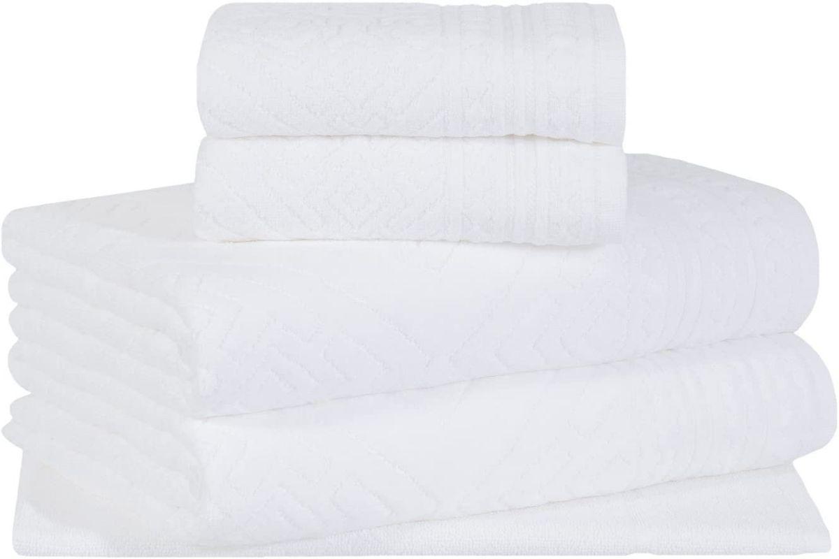 Conjunto composto por duas toalhas de corpo, duas de rosto e uma de piso. Feitas de 100% algodão e disponível em diversas cores.