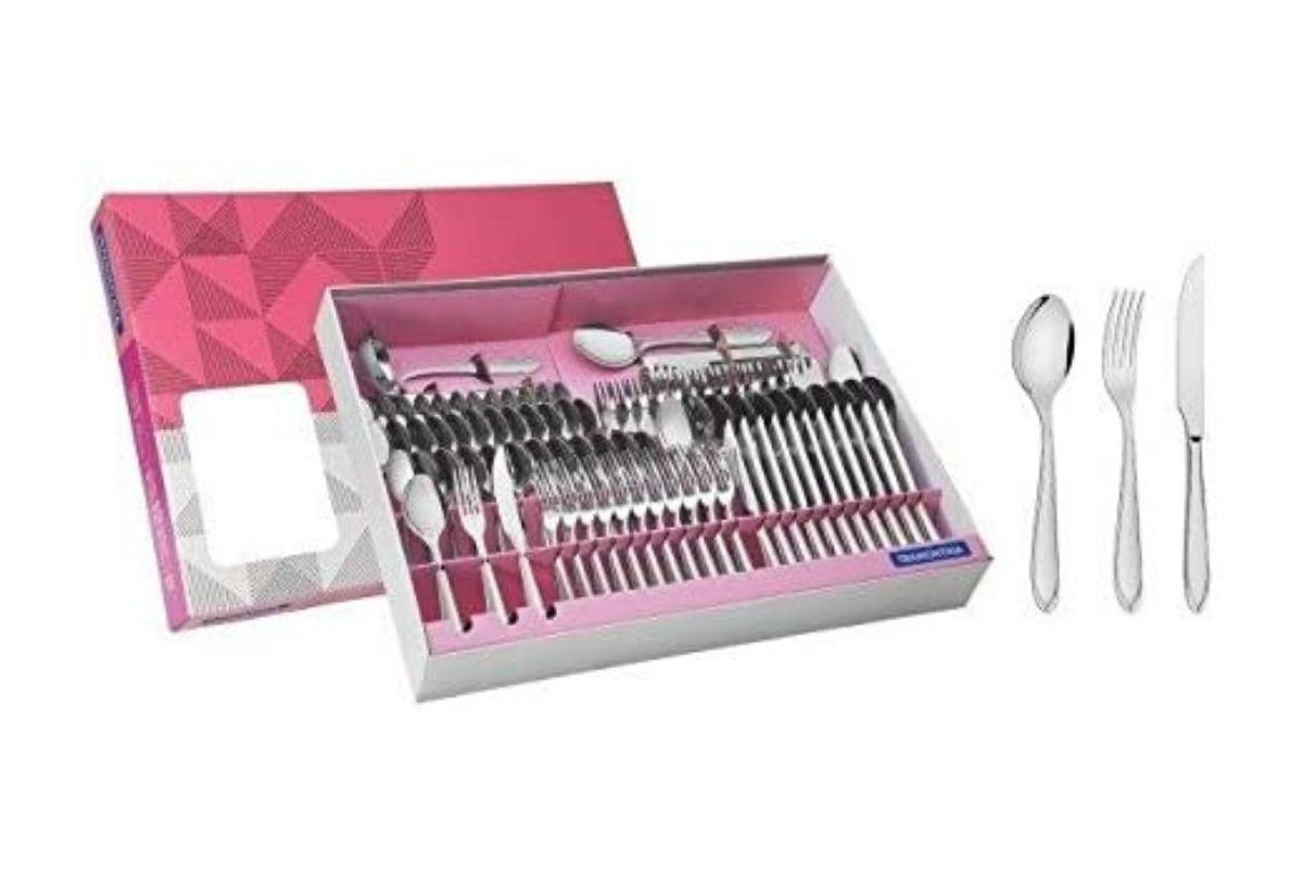 Conjunto com facas, garfos e colheres para refeição, além de peças para sobremesa e acessórios de cozinha, como pegador de salada, concha, espátula de bolo e talheres de churrasco.