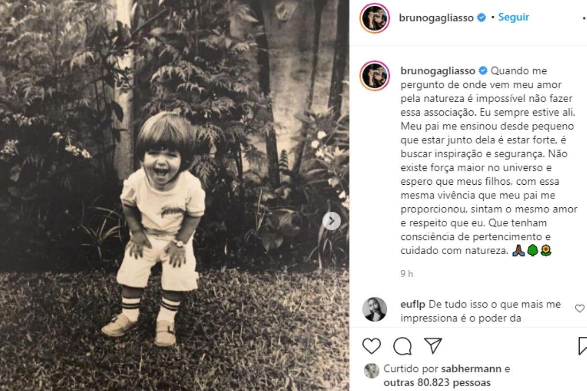 Nas fotos, o ator aparece ainda criança, curtindo a natureza ao lado da família. Vários animais e um ambiente rural aparecem no fundo. Usando isso como gancho, Bruno disse que a questão ambiental sempre esteve presente na sua vida.