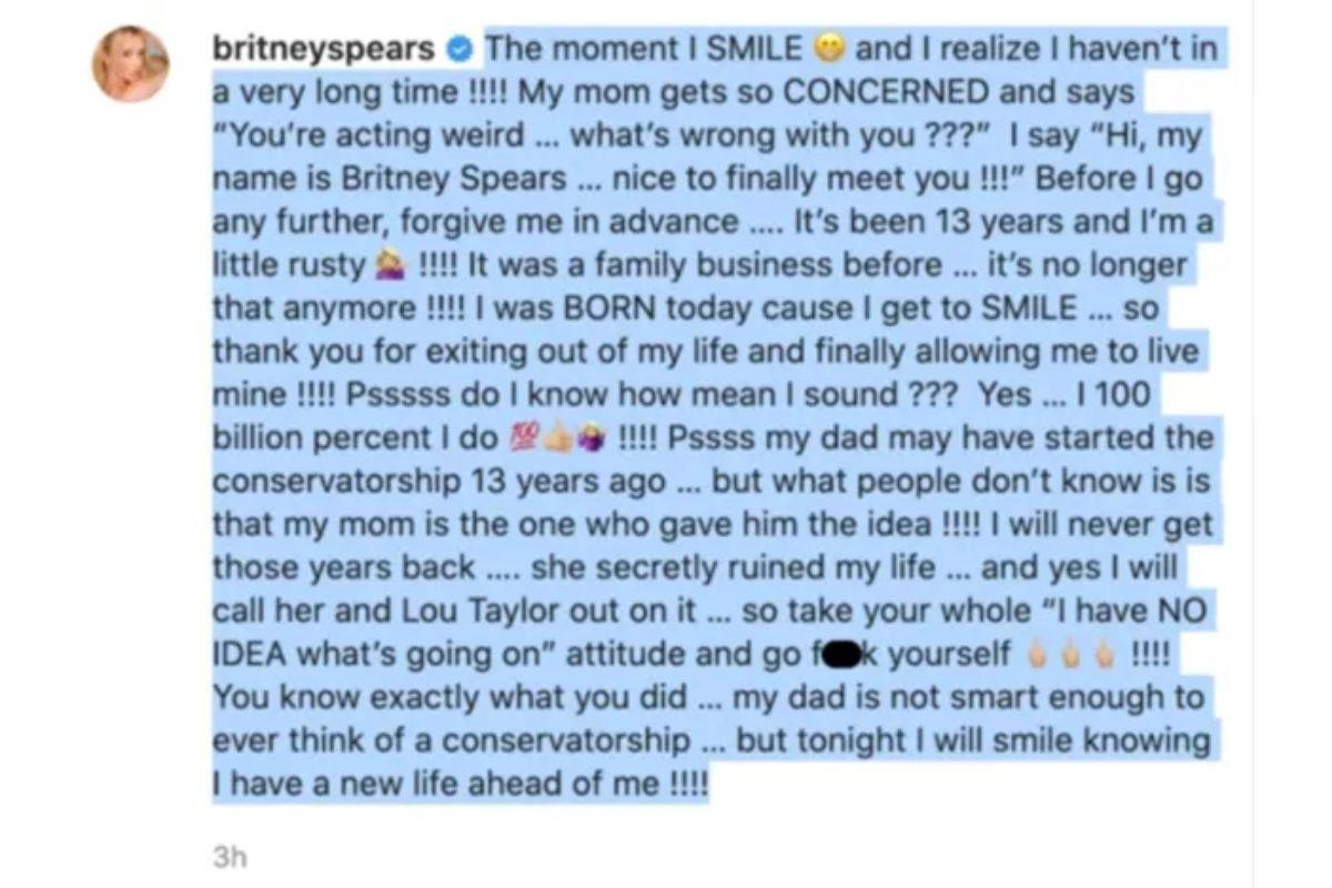 Britney Spears usou a liberdade após o fim da tutela, em setembro deste ano, para revelar a parcela de culpa que a mãe, Lynne Spears, possui no acordo que a manteve sob o controle do pai durante 13 anos. Por meio do Instagram, Britney fez um desabafo.