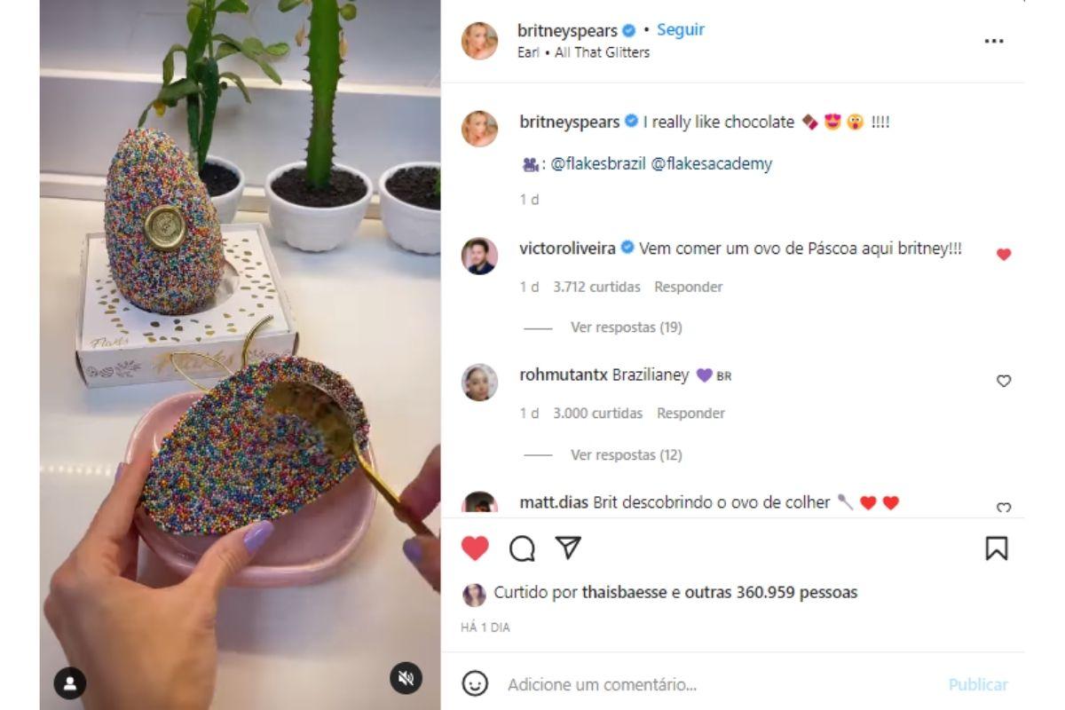 É do Brasil! Britney Spears chamou a atenção nesta última terça-feira, 30 de março, ao publicar vídeo de um Ovo de Páscoa de colher feito por uma confeitaria de Porto Velho, em Rondônia, a “Flakes Brazil”.