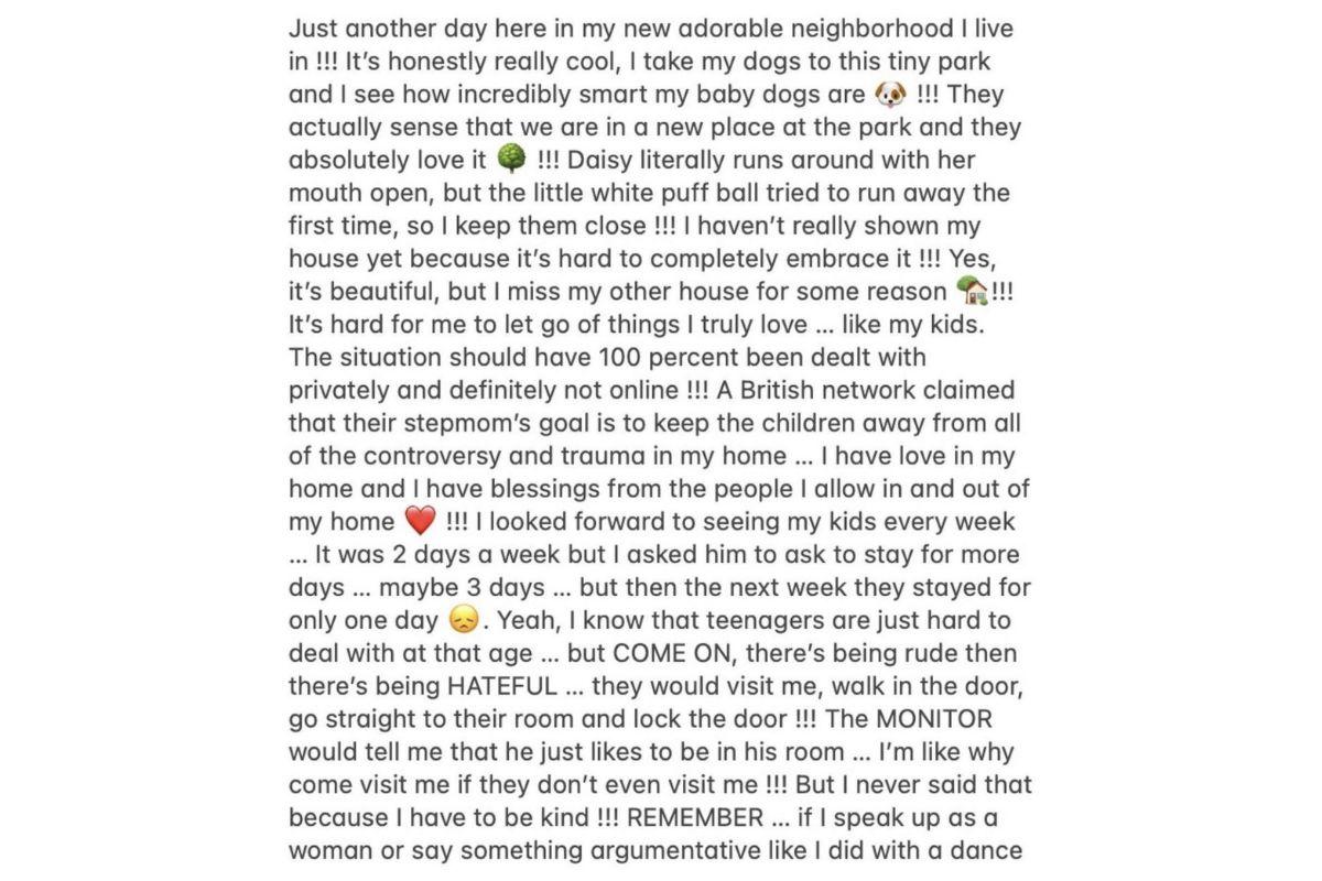 No início, Britney fala que o caso envolvendo os adolescentes deveria ter sido solucionado de forma discreta: “A situação deveria ter sido 100% tratada de forma privada e definitivamente não online! Uma rede britânica afirmou que o objetivo da madrasta deles é manter as crianças longe de toda a controvérsia e trauma em minha casa… Tenho amor em minha casa e tenho bênçãos das pessoas que permito entrar e sair!””, disse Spears.