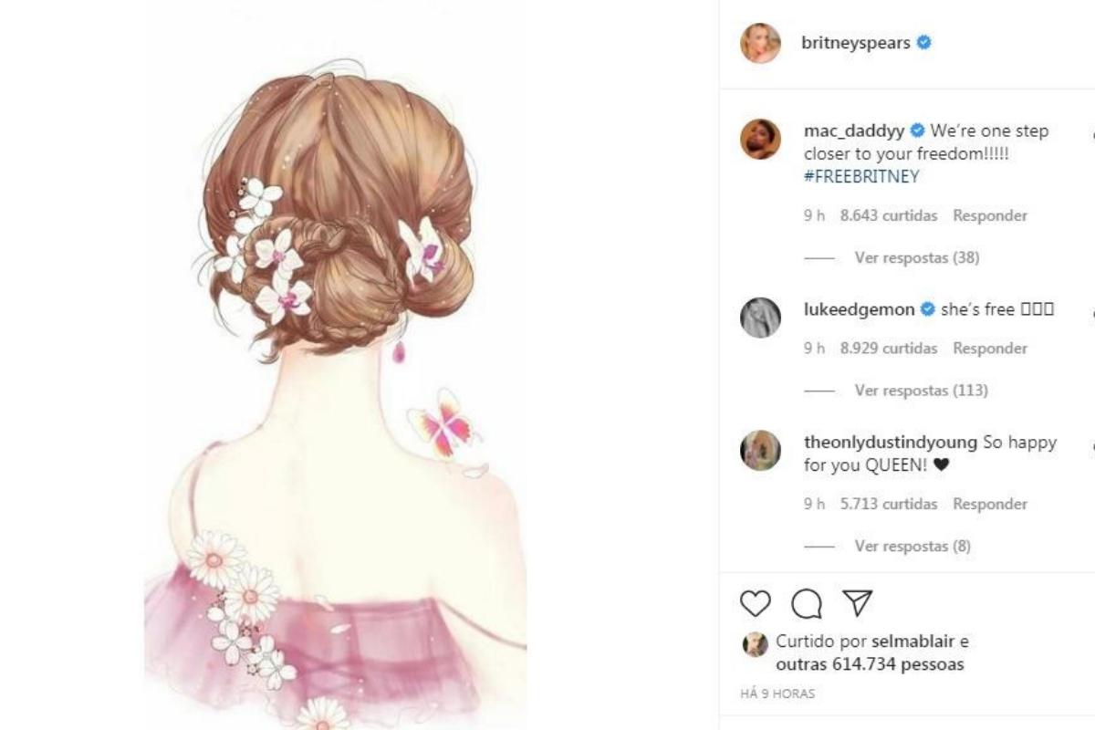 Depois do vídeo, Britney ainda postou um desenho de uma mulher que aparece de costas. Na publicação, os fãs também comemoraram e deixaram mensagens como: “Estamos a um passo da liberdade #FREEBRITNEY”. “Você vai ser livre, estamos contigo!!”.