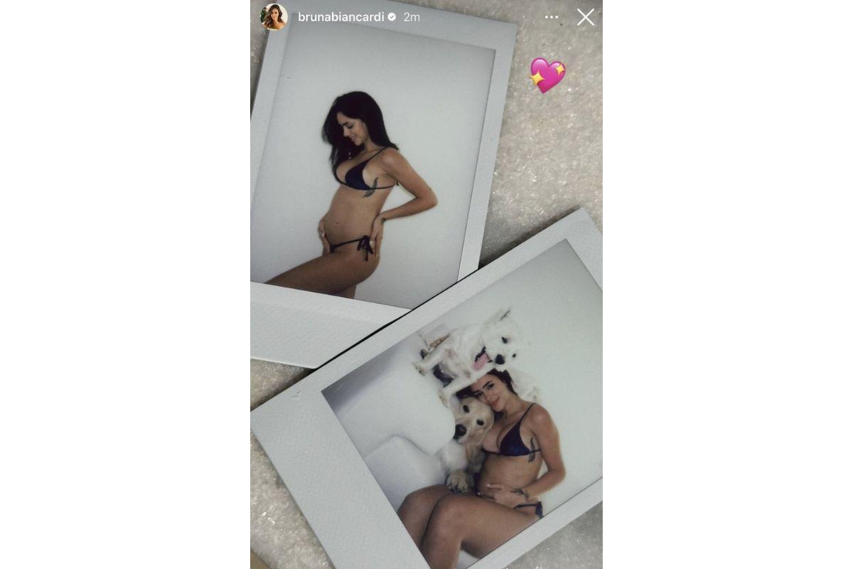 Ela estava usando um biquíni e postou nos stories da conta oficial do Instagram dela, algumas fotos tiradas por uma polaroid, em que Bruna está com as mãos na barriga. Já, na outra foto, ela está em um sofá ao lado dos cachorros dela. Muitos fã-clubes do casal comentaram sobre a publicação.