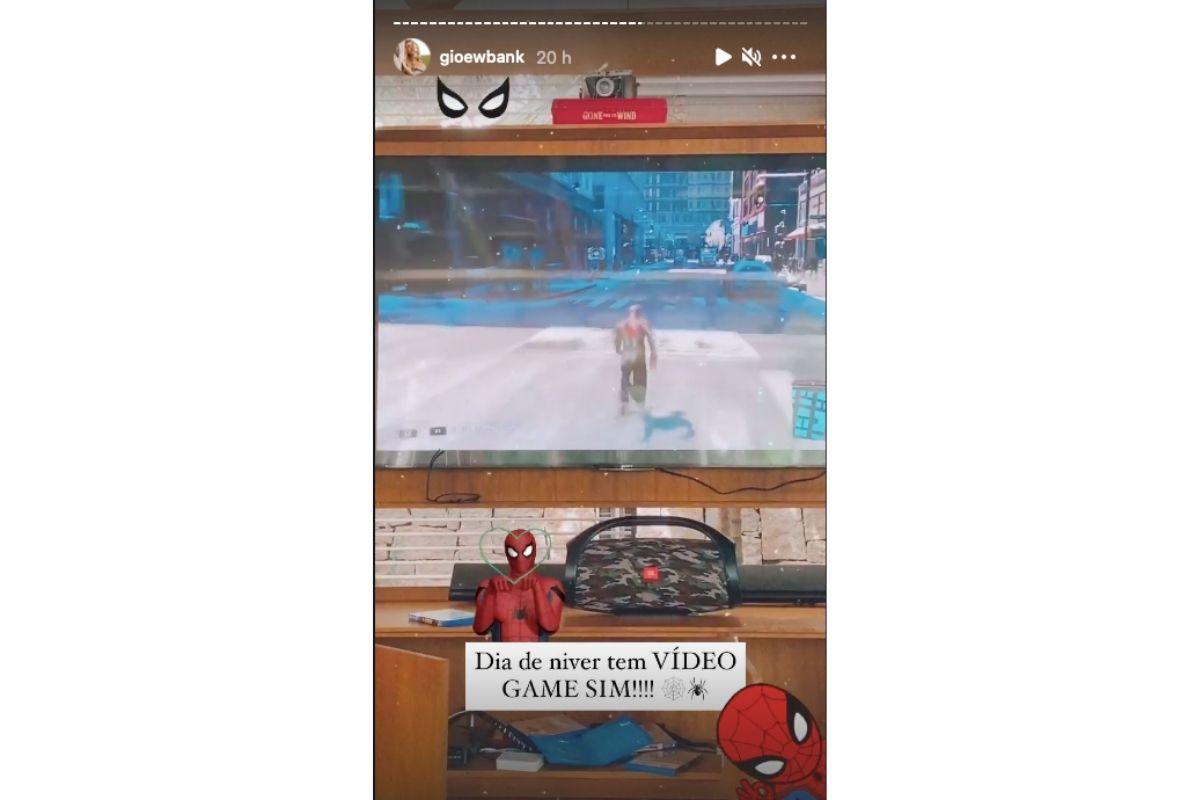 Nos stories do Instagram a apresentadora mostrou o menino, apaixonado pelo homem aranha, jogando o vídeo-game do herói no dia do aniversário e escreveu: “Dia de niver tem vídeo-game sim!”, com vários desenhos de homem aranha ao fundo.