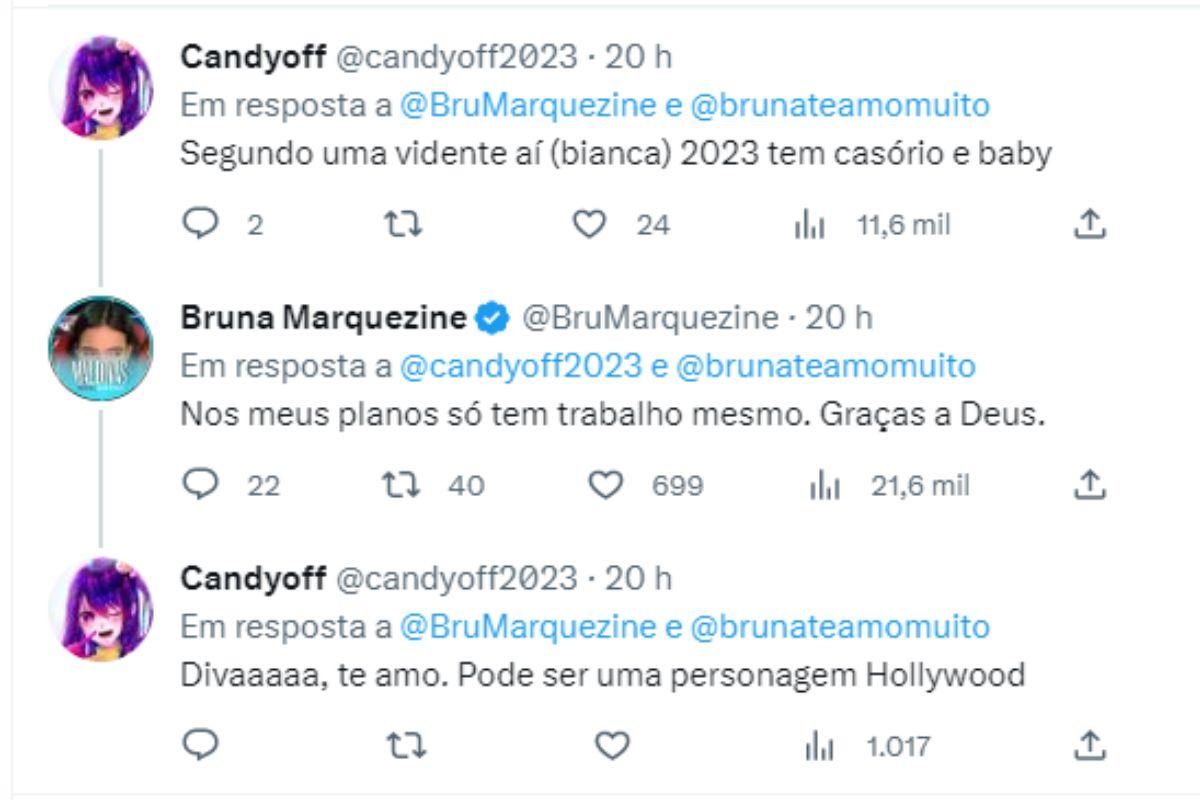 “Pode parar de querer”, escreveu ela. Em seguida a fã respondeu: “Sem pressão”, com uma montagem da atriz grávida. No mesmo tweet outra usuária da rede social falou sobre uma visão do futuro em que ela casaria e seria mãe em 2023: “Nos meus planos só tem trabalho mesmo. Graças a Deus.”, respondeu Bruna