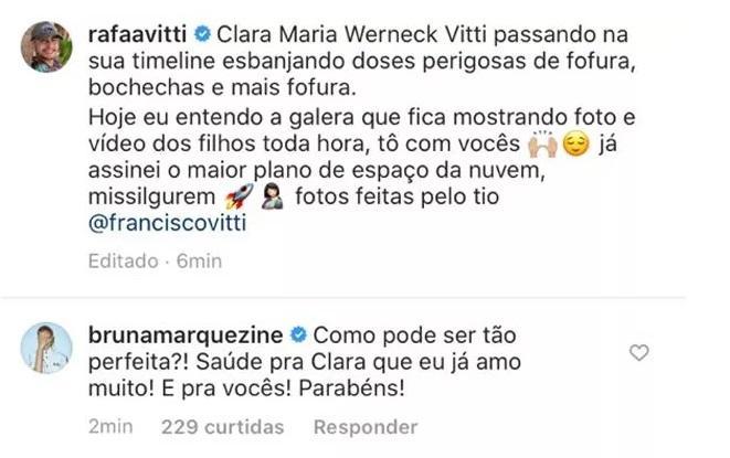 Rafa Vitti publicou em suas redes um clique carinhoso com a filha e finalmente revelou o nome escolhido pelo casal. “Clara Maria Werneck Vitti passando na sua timeline esbanjando doses perigosas de fofura, bochechas e mais fofura”, brincou na legenda.