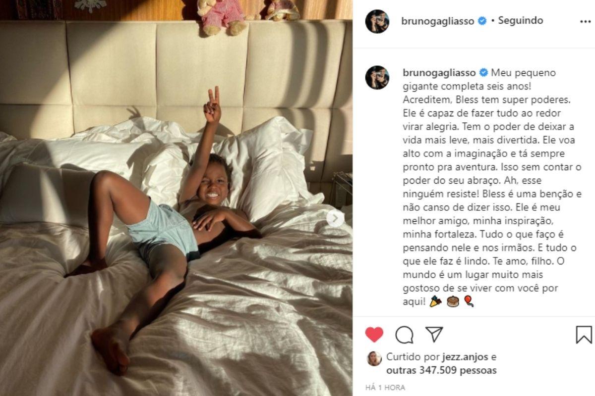 O ator Bruno Gagliasso usou as redes sociais nesta quarta-feira, 16 de dezembro, para comparilhar uma linda homenagem ao filho, Bless, que completa 6 anos hoje. Em uma publicação no Instagram, o famoso mostrou algumas fotos do filho, além de um lindo texto de parabéns. O ator também é pai de Titi e Zyan, fruto do relacionamento com a apresentadora Giovanna Ewbank.