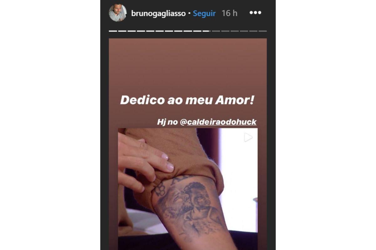 Bruno ainda aproveitou para publicar uma foto do desenho e se declarar para filha. “Dedico ao meu amor. Segunda semana no @caldeiraodohuck! Semana que vem peço música hein! Hoje mostrei a tattoo que fiz pra minha filha e agora ela tá toda toda kkkk… Te amo, filha! Do tamanho do universo!”, escreveu Bruno ao compartilhar o vídeo do programa.
