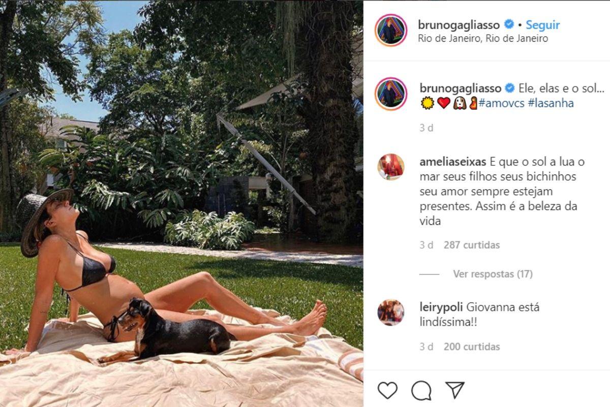 Na foto, publicada por Bruno no Instagram, Giovanna apareceu tomando sol ao lado da pet da família e o ator escreveu na legenda: “Ele, elas e o sol”, confirmando que a criança será um menino.