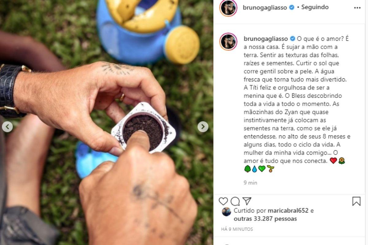 Na sequência, Bruno continua a reflexão sobre o momento em família: “É sujar a mão com a terra. Sentir as texturas das folhas, raízes e sementes. Curtir o sol que corre gentil sobre a pele. A água fresca que torna tudo mais divertido”.