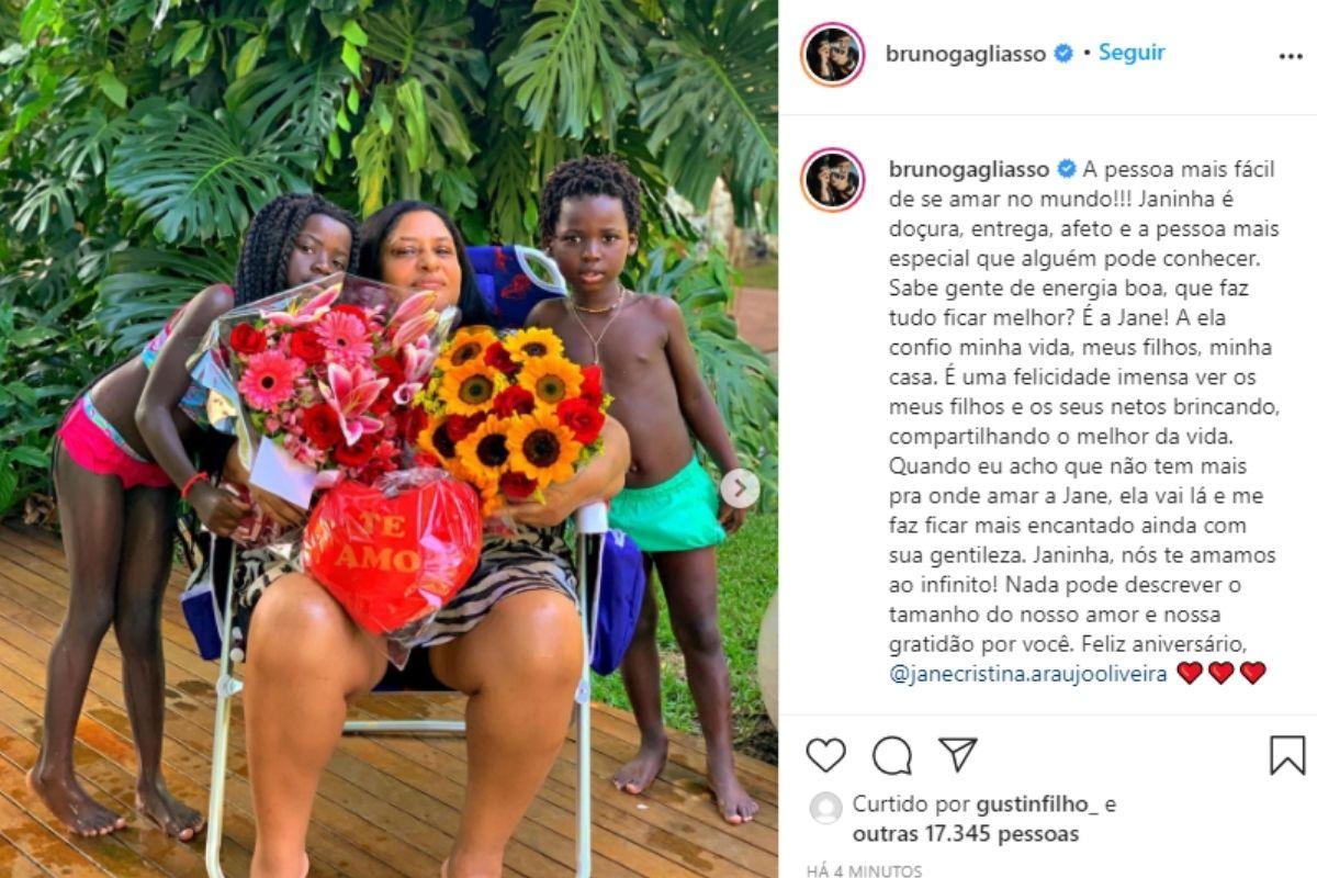 Bruno Gagliasso dedicou um tempo deste domingo, 17 de janeiro, para fazer uma homenagem a um membro importante da família: a babá dos filhos. Jane Cristina Araujo Oliveira já é considerada a “segunda mãe” do ator e aparece com frequência nos stories do artista e da esposa, Giovanna Ewbank.