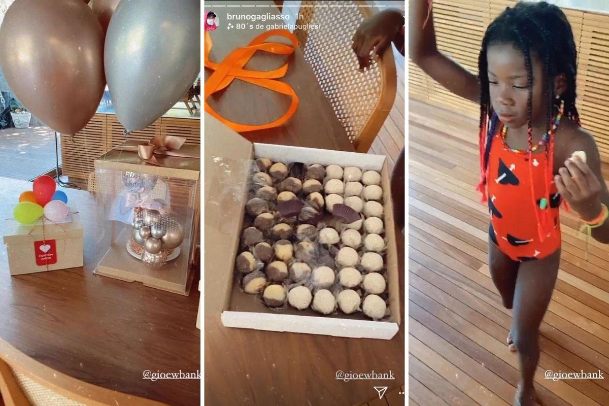 No registro, Bruno mostra alguns presentes e doces que encomendou para a data especial de Giovanna. Titi inclusive, adorou as guloseimas. “Hoje vai ser muito animado! Dona Chissomo já está comendo doce, já abriu o que encomendei para a mamãe”, disse o ator  todo animado enquanto cantava, mostrando a filha na sequência.