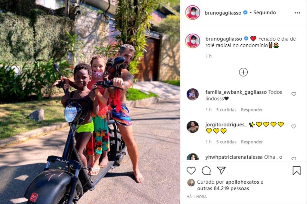 Ele colocou as os filhos e uma amiga das crianças, em cima de uma motocicleta elétrica e brincou na legenda da imagem: “Feriado é dia de rolê radical no condomínio”. Os internautas ficaram babando pelo sorriso no rosto das crianças e rasgaram elogios: “Família é tudo!”, disse uma. “Vocês trazem tanta luz” falou outra.