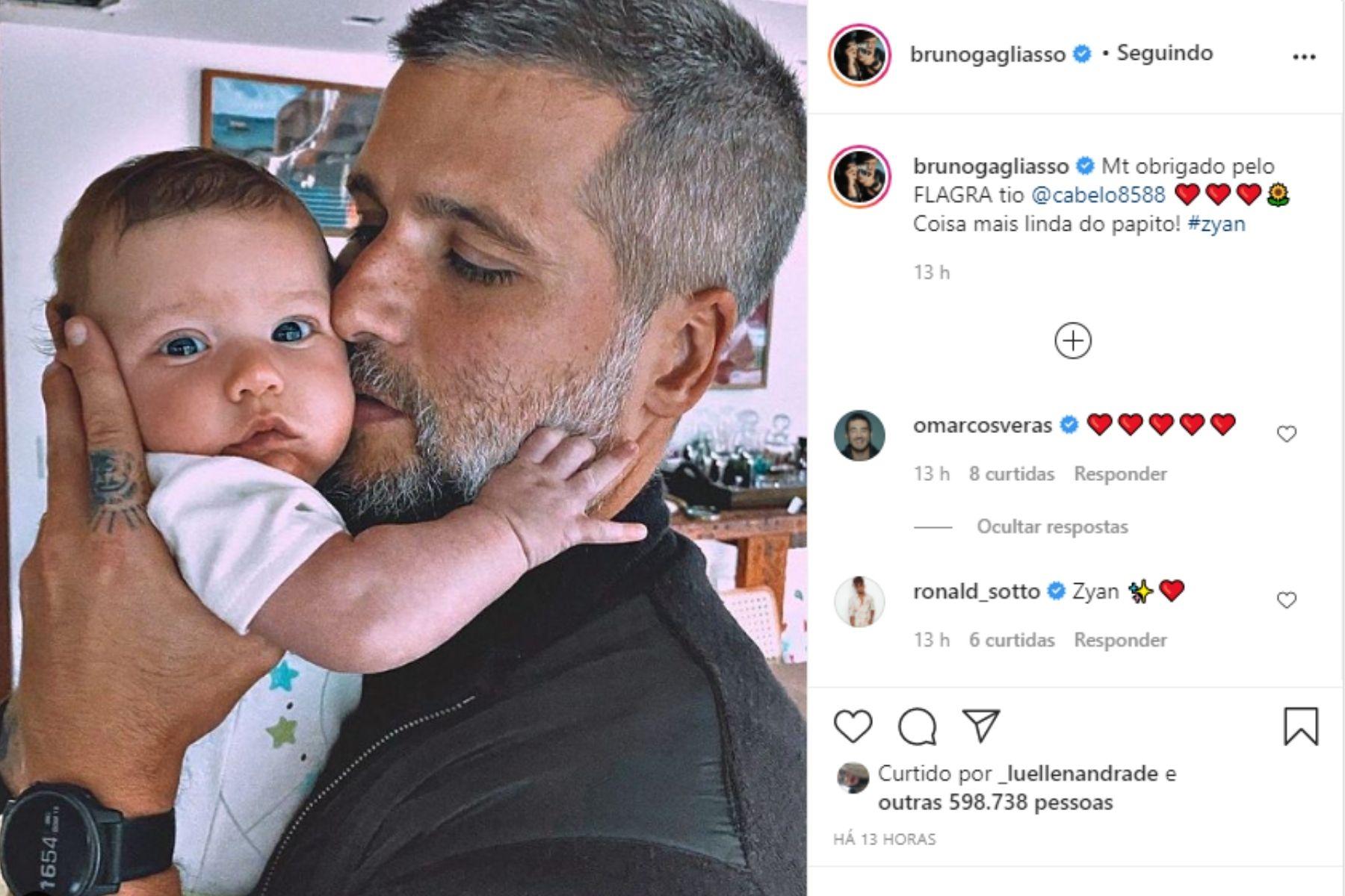 Na imagem, o ator aparece abraçando Zyan, que olha para a câmera. “Muito obrigado pelo flagra, tio Thiago Jenne. Coisa mais linda do papito”, escreveu Bruno na legenda da publicação. O clique não passou despercebido no feed dos fãs, em especial da mãe. “Aiaiaiaiai que delicia”, escreveu Giovanna Ewbank nos comentários.