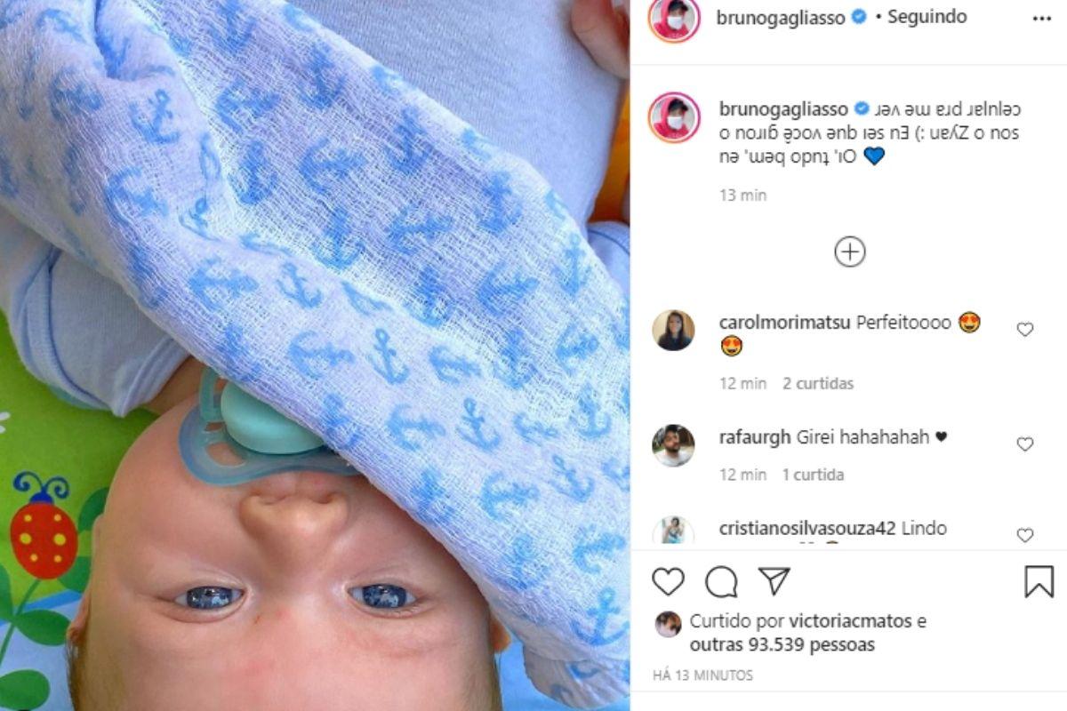 O ator Bruno Gagliasso usou as redes sociais nesta sexta-feira para compartilhar uma foto em que mostra o rosto do filho, Zyan. O famoso compartilhou a imagem de ponta cabeça e fez uma brincadeira com os seguidores na legenda. “Oi, tudo bem, eu sou o Zyan 🙂 Eu sei que você girou o celular pra me ver”, escreveu o famoso ao compartilhar a imagem.