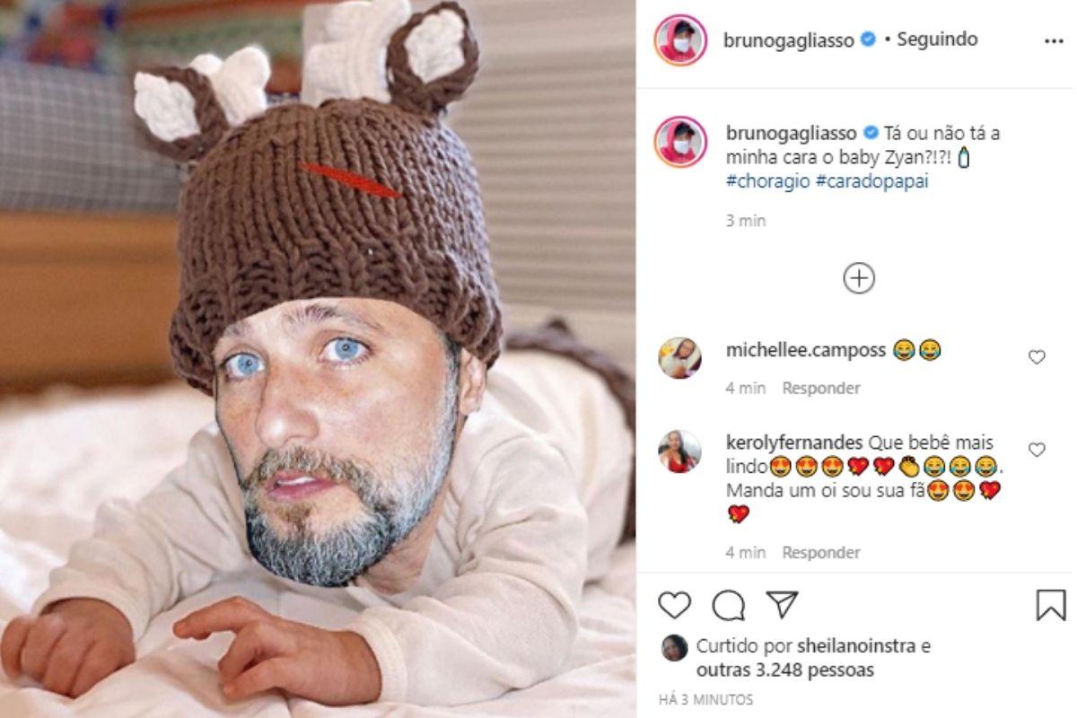 O ator Bruno Gagliasso usou as redes sociais nesta terça-feira, 6 de outubro, para fazer uma brincadeira com os seguidores. O famoso compartilhou uma montagem em que o rosto dele aparece no corpo de Zyan. “Tá ou não tá a minha cara o baby Zyan?!?!”, brincou ao compartilhar a imagem.