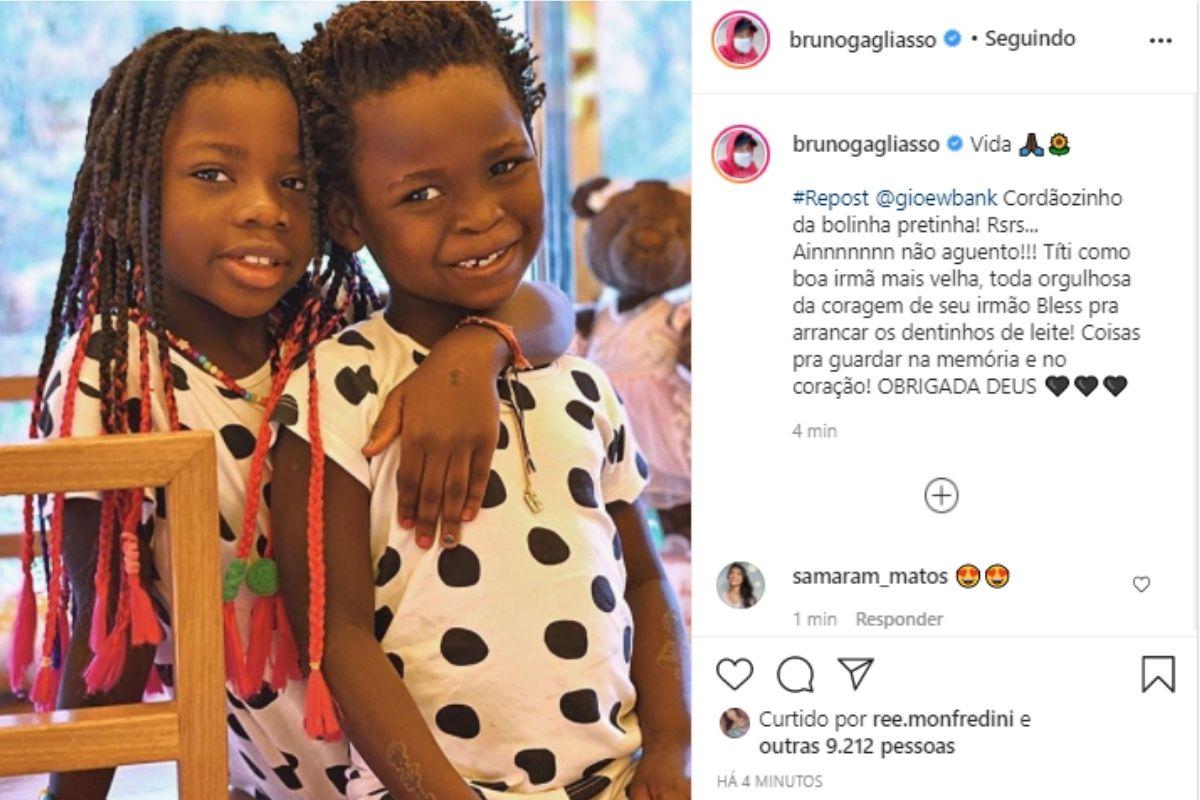“Cordãozinho da bolinha pretinha! Rsrs… Ainnnnnnn não aguento!!! Títi como boa irmã mais velha, toda orgulhosa da coragem de seu irmão Bless pra arrancar os dentinhos de leite! Coisas pra guardar na memória e no coração! OBRIGADA DEUS”, escreveu Giovanna Ewbank ao publicar as imagens. “Vida”, acrescentou Bruno Gagliasso ao repostar a publicação.