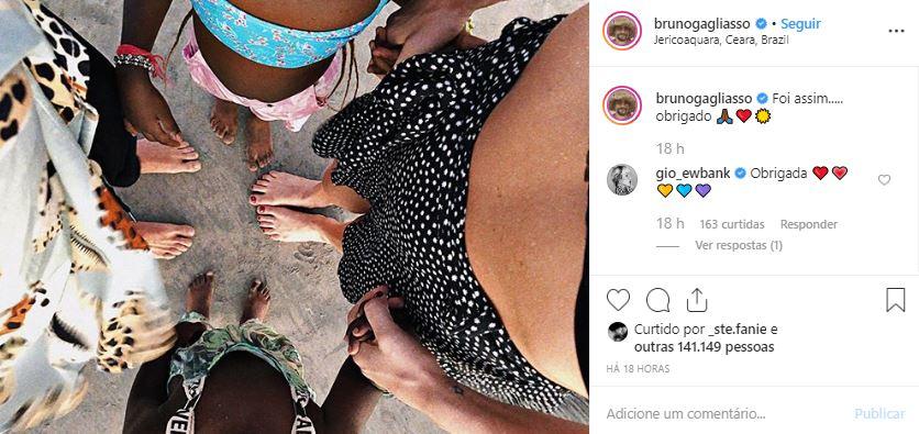 “Foi assim… Obrigado”, disse Bruno na legenda da publicação. A família estava curtindo as férias em Jericoacoara, no Ceará. “Obrigada”, respondeu Giovanna Ewbank nos comentários.