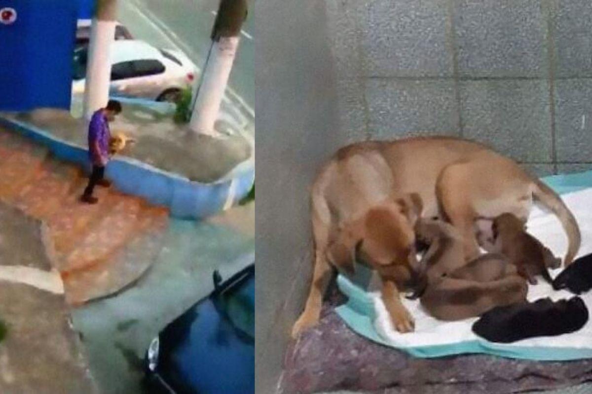 As câmeras de segurança do estabelecimento mostram dois momentos. Primeiro, mostra a cachorra esperando por um tempo até que o veterinário saísse para vê-la. O profissional notou que ela estava grávida e prestes a dar à luz. Sem hesitar, ele a levou para dentro da clínica.