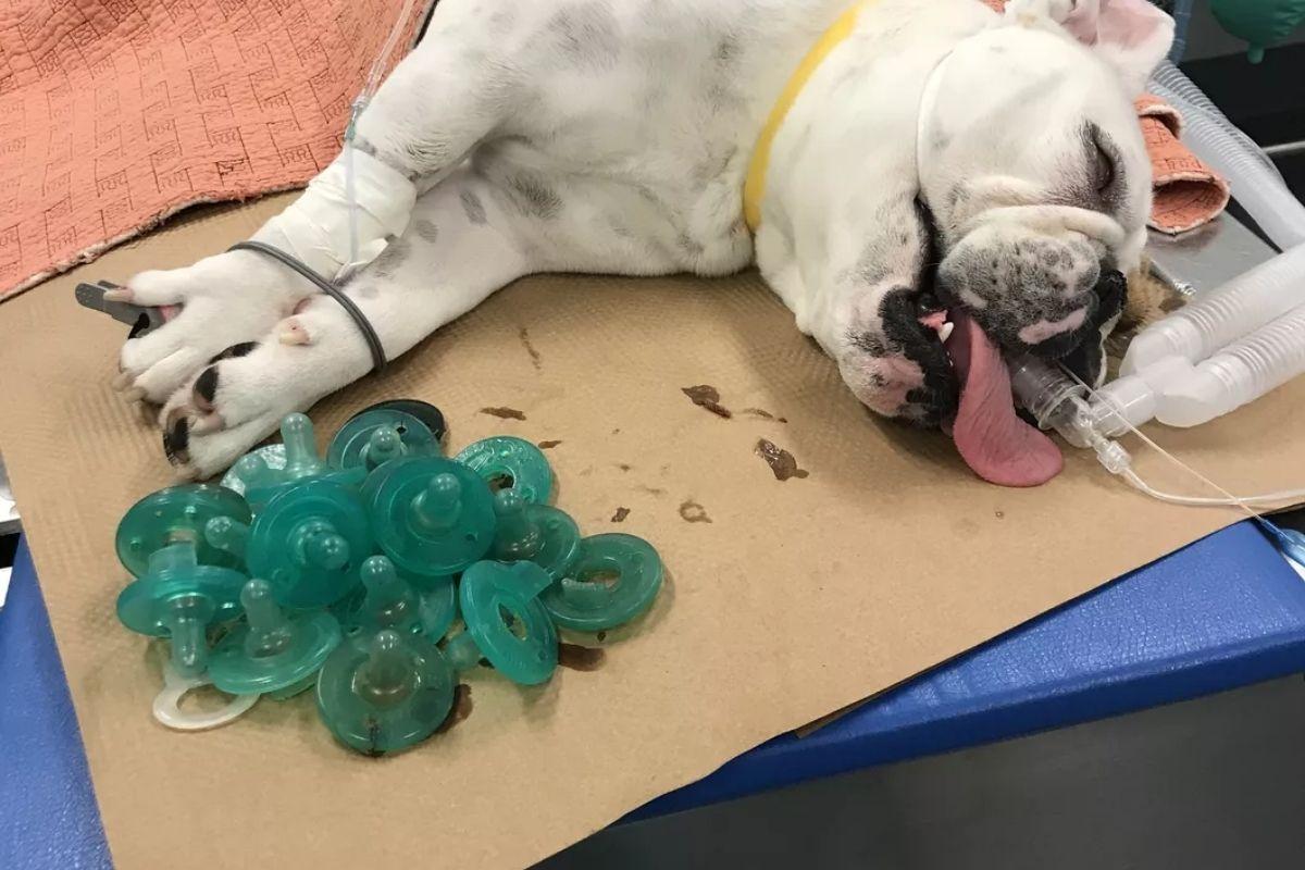 Um cachorro da raça bulldog de Boston, nos Estados Unidos, engoliu nada menos do que 19 chupetas — que ele roubava dos filhos do dono ao longo de vários meses. A dona do cão de três anos de idade, Emily Shanahan, estava preocupada com a saúde do bicho de estimação. Mortimer vinha passando por repetidos episódios de vômito e náusea.
