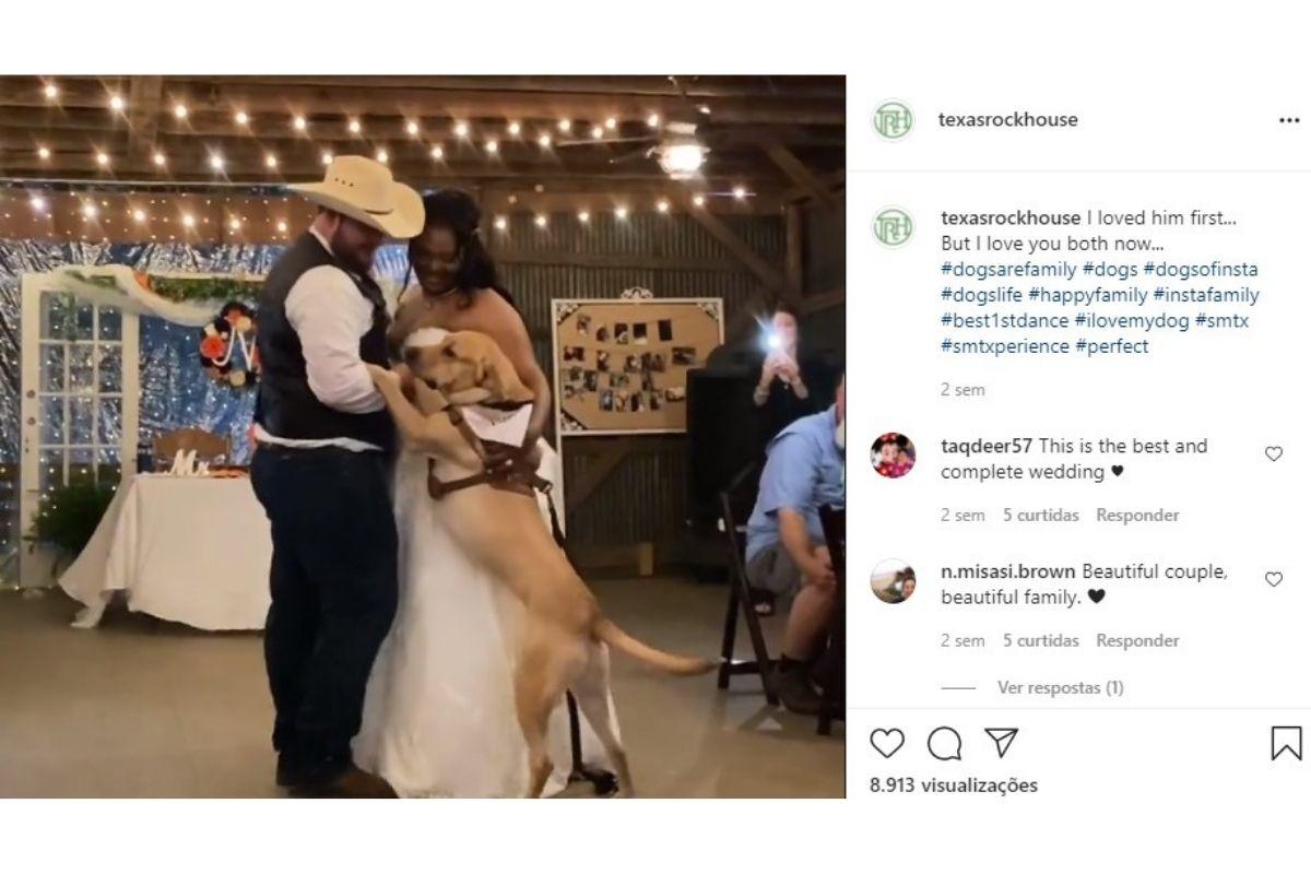 Um casal do Texas, nos Estados Unidos, contou com a participação especial do cachorro de estimação na hora da valsa. O pet roubou a cena da tradicional dança dos noivos ficando abraçado com eles por alguns segundos. A festa de casamento é um dos momentos mais importantes para muitos casais e contar com a participação daqueles a quem se ama é fundamental para tornar o momento ainda mais feliz, então é claro que não podia faltar a participação do “filho” de quatro patas.