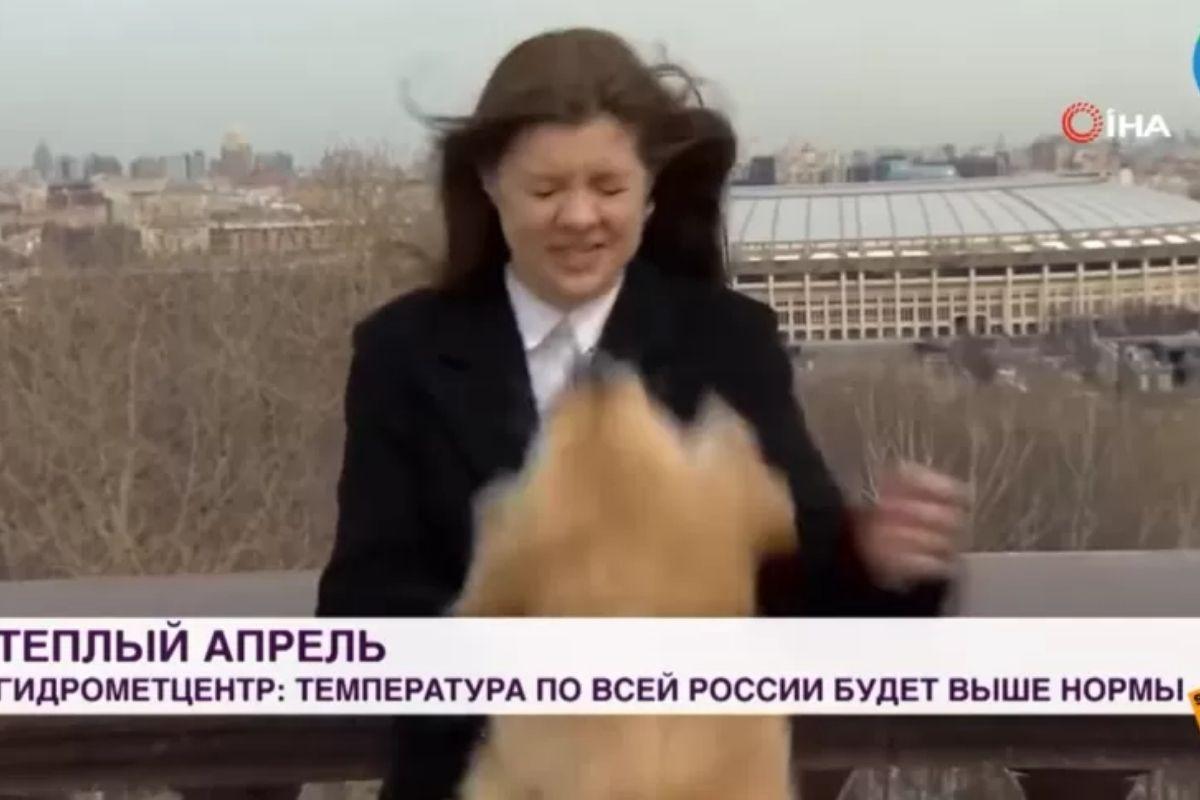 Quem sabe faz ao vivo! Durante uma transmissão, a repórter russa, Nadezhda Serezhkina, viveu uma situação bastante diferente do que costuma acontecer no dia a dia do canal de TV, MIR 24. Enquanto falava sobre a queda de temperaturas em Moscou, ela foi surpreendida por um cachorro da raça Golden Retriver!