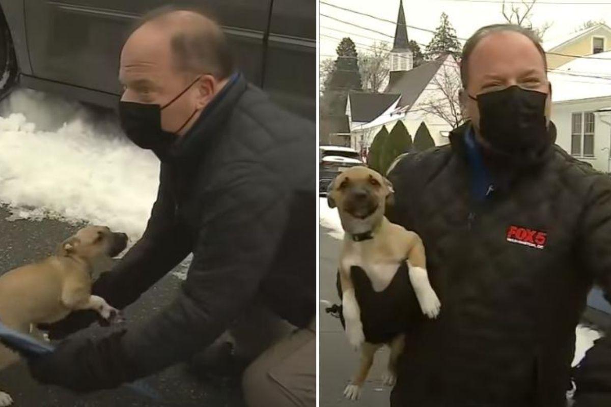 Um repórter foi interrompido da maneira mais fofa possível enquanto estava ao vivo na televisão: com lambidas de um cachorro perdido. Bob Barnard, da FOX 5 DC, estava falando sobre o clima do estado da Virgínia, nos Estados Unidos, quando o filhote surgiu correndo pela avenida e começou a rodeá-lo. O jornalista então pega o animal no colo e ajuda a encontrar seu dono.