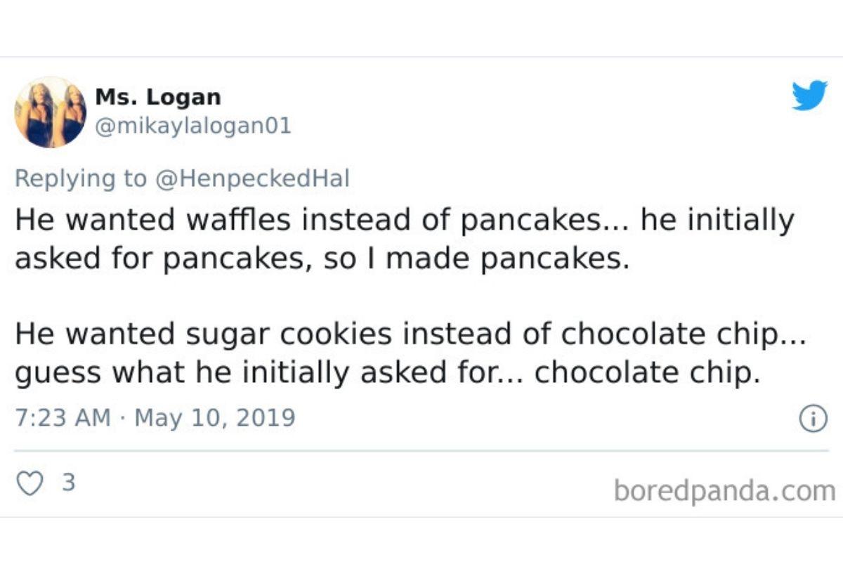 Tradução: “Ele (chorou porque) queria waffles em vez de panquecas…. Foi ele quem pediu pelas panquecas antes, por isso eu fiz panquecas.