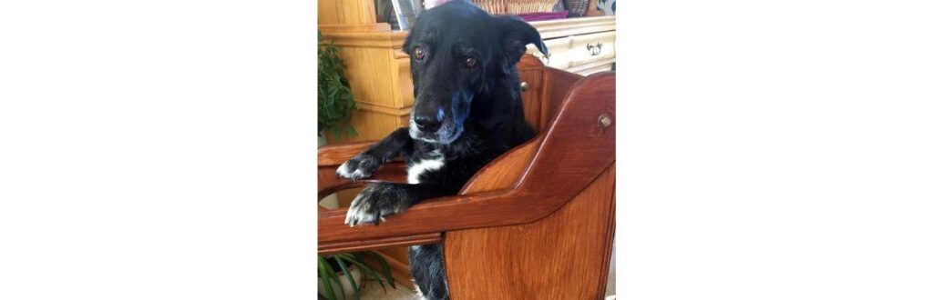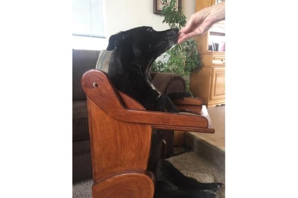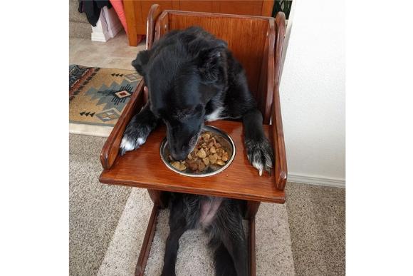 Daisey amava sua cadeira e até aprendeu a usar: assim que percebe que é hora de comer, ela já vai sozinha para lá e se senta esperando a tigela de ração.