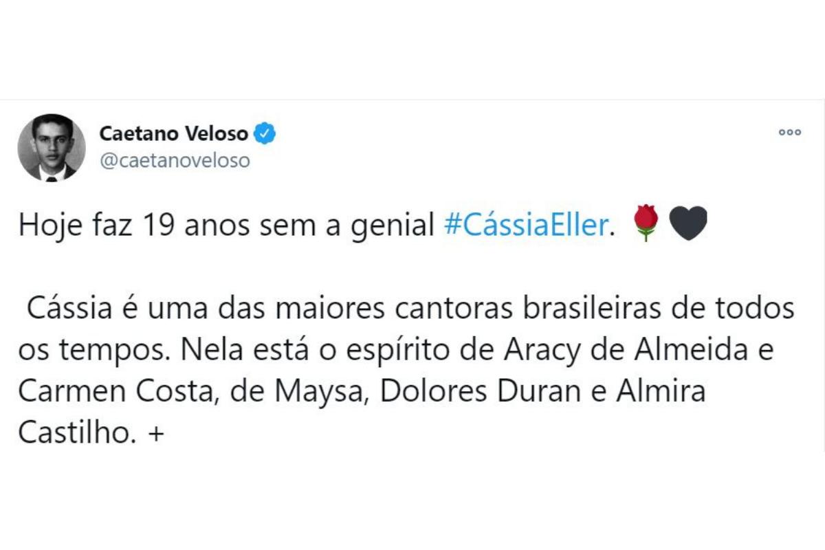 No Instagram, ele escreveu: “Hoje faz 19 anos sem a genial #CássiaEller. 🌹🖤’Cássia é uma das maiores cantoras brasileiras de todos os tempos. Nela está o espírito de Aracy de Almeida e Carmen Costa, de Maysa, Dolores Duran e Almira Castilho. Não é por acaso que seu rock’n’roll se refere ao flamenco, à canção francesa mais visceral e ao blues. Cássia é verdade pura’.”