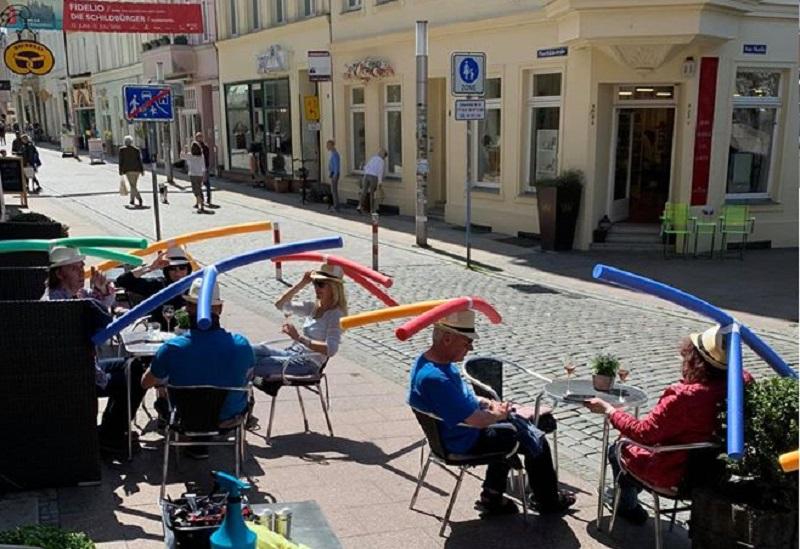Além de colocar as mesas do lado de fora com 1,5 metro entre elas, o Cafe & Konditorei Rothe, que fica em Schwerin, deu aos clientes chapéus com boias de piscina no modelo de espaguete amarrados neles.
