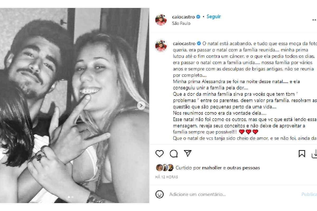 Na noite deste sábado, 25 de dezembro, Caio Castro compartilhou uma sequência de fotos com a prima, Alessandra, para lamentar o falecimento dela, após algum tempo combatendo contra um câncer.