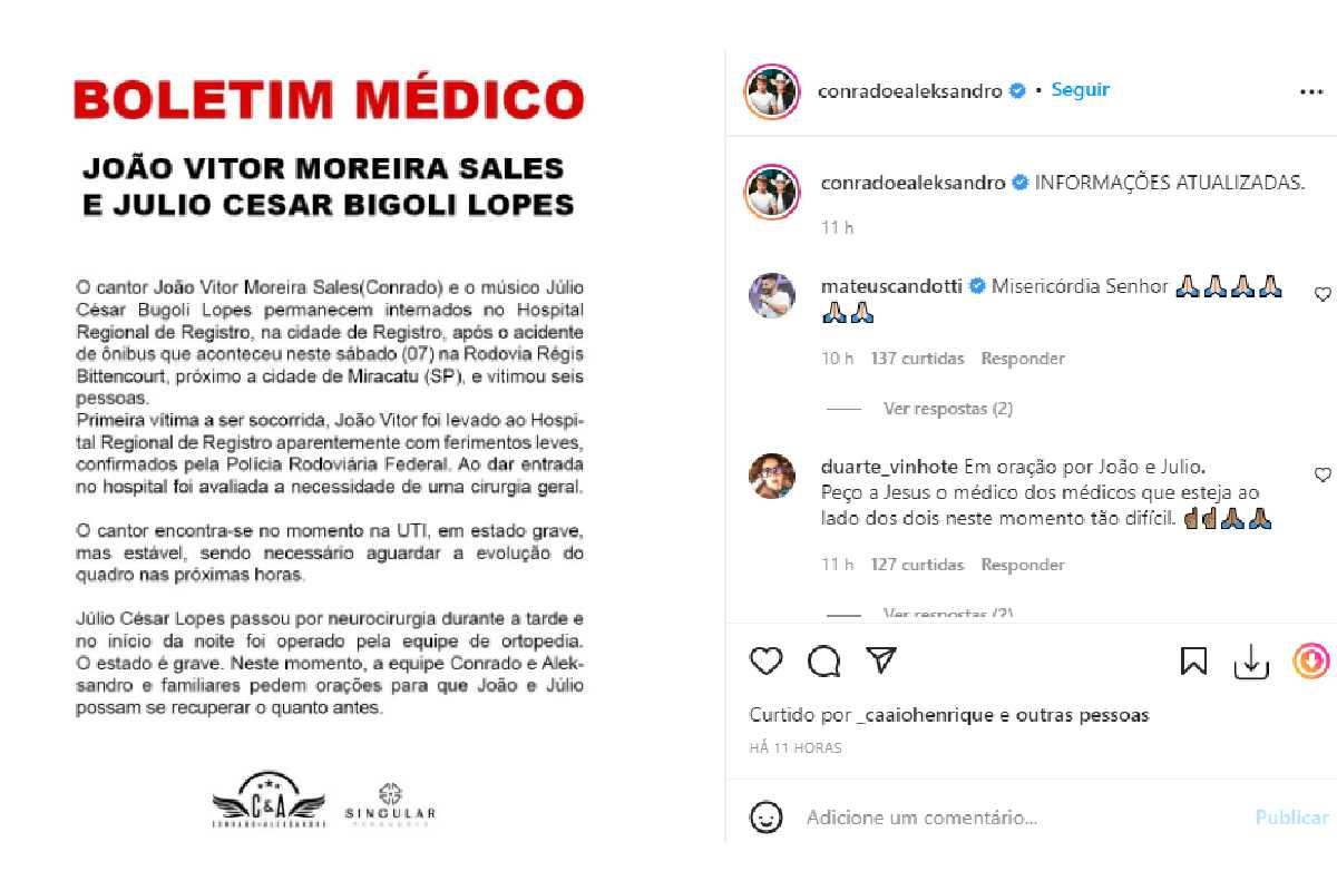“O cantor João Vitor Moreira Sales (Conrado) e o músico Júlio César Bugoli Lopes permanecem internados no Hospital Regional de Registro, após acidente de ônibus que aconteceu neste sábado (07) na Rodovia Régis Bittencourt, próximo a cidade de Miracatu (SP) e vitimou seis pessoas”, começou o boletim.