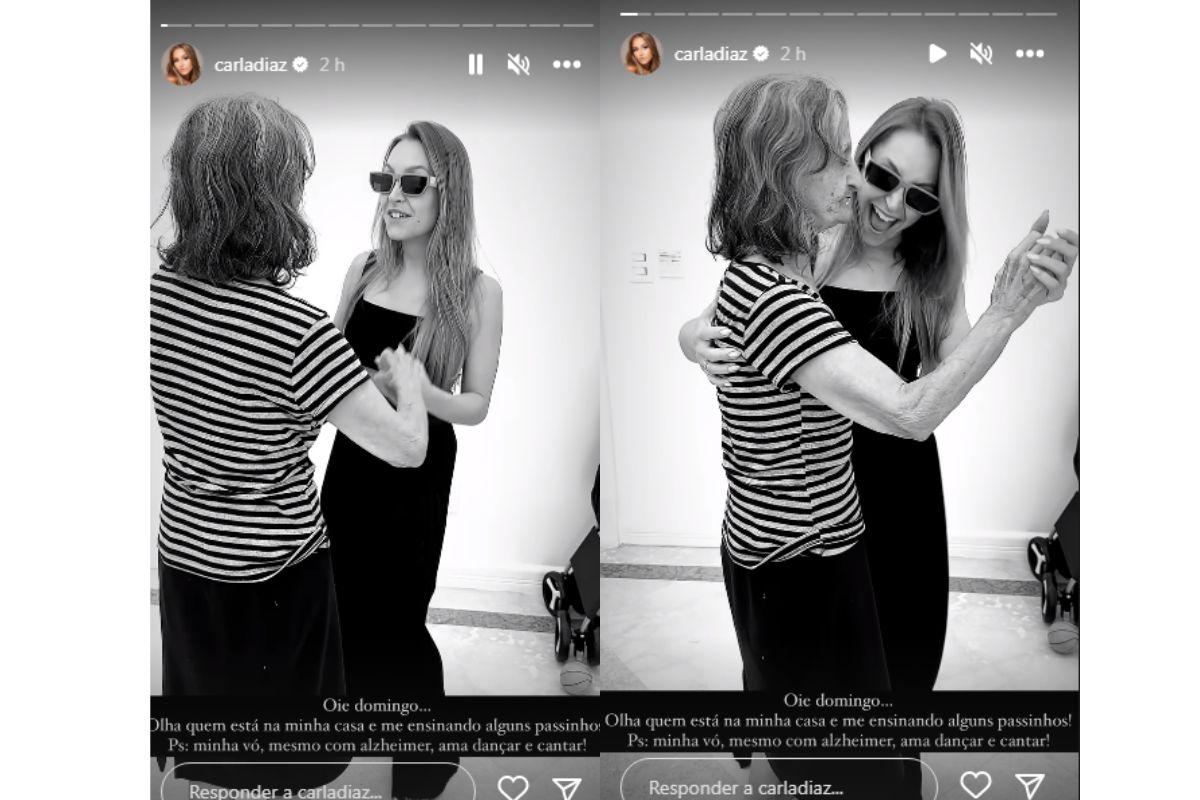 Neste domingo, 23 de abril, Carla Diaz recebeu a visita de sua avó materna, que foi diagnosticada com Alzheimer. A atriz aproveitou o momento para publicar nas redes sociais um vídeo mais que especial dançando com a avó, que pareceu bem animada. “Olha quem está na minha casa e me ensinando alguns passinhos. Minha avó, mesmo com Alzheimer, ama dançar e cantar”, contou a atriz.