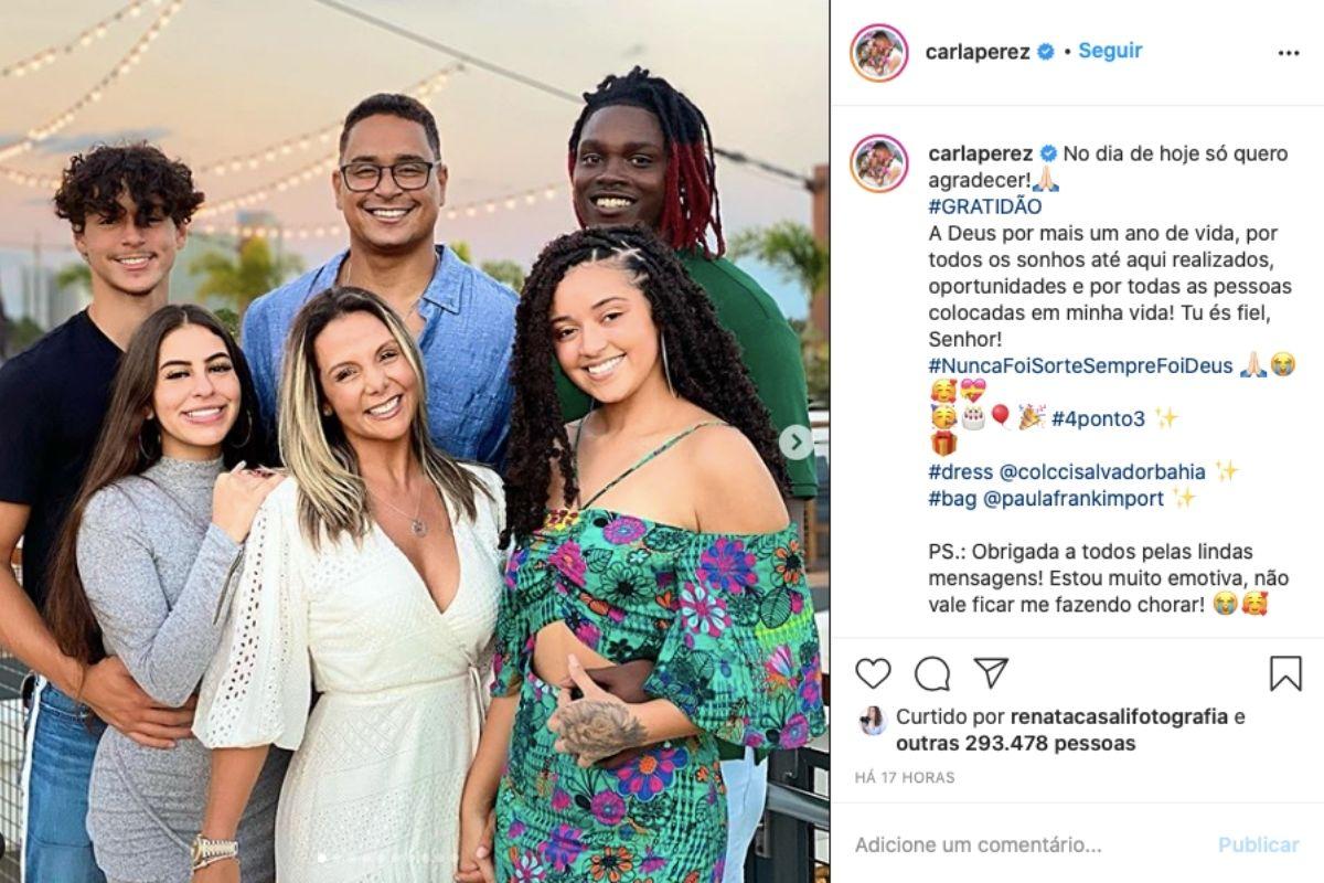 Recentemente, Carla Perez comemorou os 43 anos de idade. Ela celebrou a data especial ao lado da família e usou o dia especial para agradecer por tudo de bom que aconteceu durante a vida. Segundo o portal UOL, a cantora ainda compartilhou nas redes sociais fotos ao lado do marido, Xanddy, da filha Camilly Vitória, do filho Victor Alexandre, do genro e da nora.