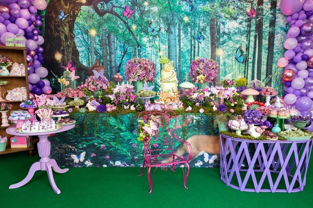Com o tema “Floresta Encantada”, a festa estava linda com fadas, borboletas e uma decoração em tons de lilás, que deu um ar muito mágico. Confira as fotos abaixo: