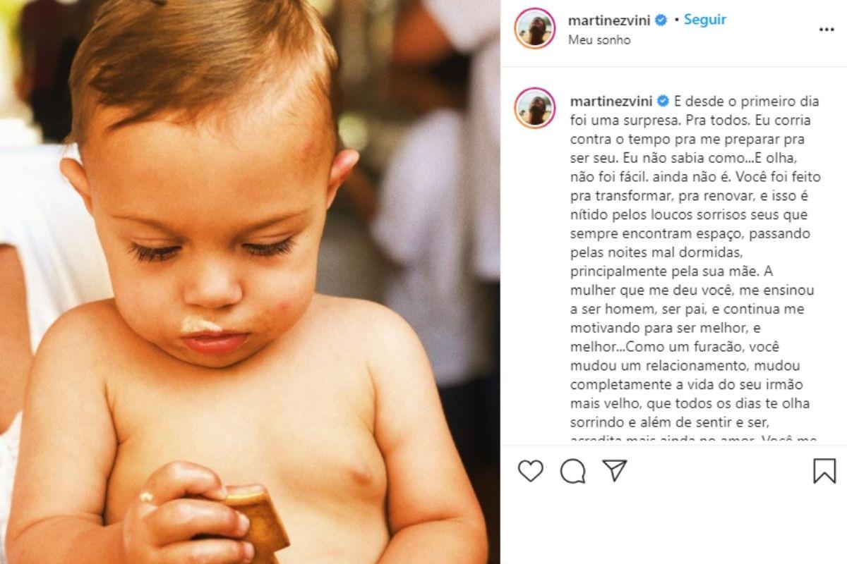 E as homenagens não pararam por aí! O pai, Vinicius Martinez, publicou uma foto do filho e também contou sobre a relação da família. “E desde o primeiro dia foi uma surpresa. Pra todos. Eu corria contra o tempo pra me preparar pra ser seu. Eu não sabia como…E olha, não foi fácil. ainda não é. Você foi feito pra transformar, pra renovar, e isso é nítido pelos loucos sorrisos seus que sempre encontram espaço, passando pelas noites mal dormidas, principalmente pela sua mãe. A mulher que me deu você, me ensinou a ser homem, ser pai, e continua me motivando para ser melhor, e melhor…Como um furacão, você mudou um relacionamento, mudou completamente a vida do seu irmão mais velho, que todos os dias te olha sorrindo e além de sentir e ser, acredita mais ainda no amor. Você me trouxe uma família. Uma família tão grande…Muito maior que eu esperava”, escreveu ele.